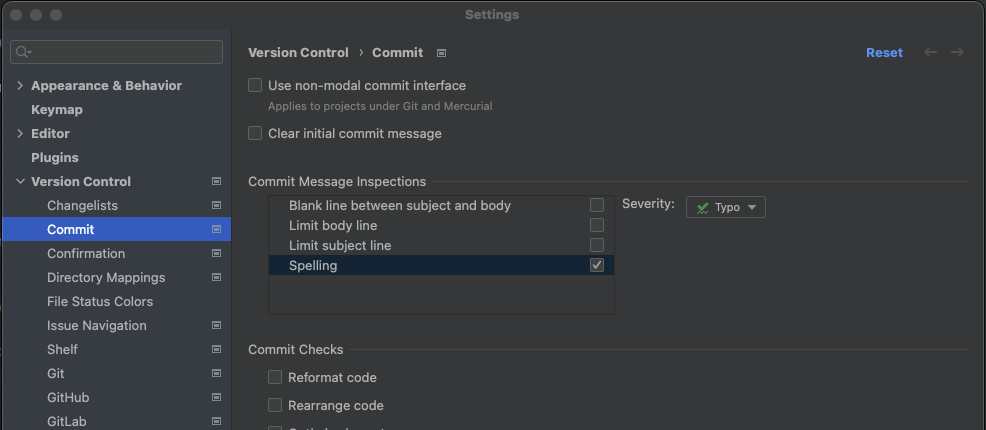 IntelliJ 계열의 툴 들을 사용하면서 눈에 좀 거슬렸던 것 중에 하나가, Commit Message를 작성할 때 Typo check가 되면서 밑줄이 쳐진다는 것이었다.