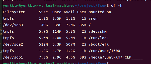 시스템에 mount 된 디스크 용량 및 사용량을 확인할 수 있다. USB메모리, SD카드 등의 용량도 확인할 수 있다.